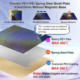 صفحه ساخت با پوشش PEI و PEY هولوگرافیک می تواند بافت هایی فانتزی به قطعات چاپ شده منتقل کند. سمت صاف PEY درخشان بوده و سمت بافت دار PEI حس مات و یخ زده فوق العاده ای به قطعه می دهد.
