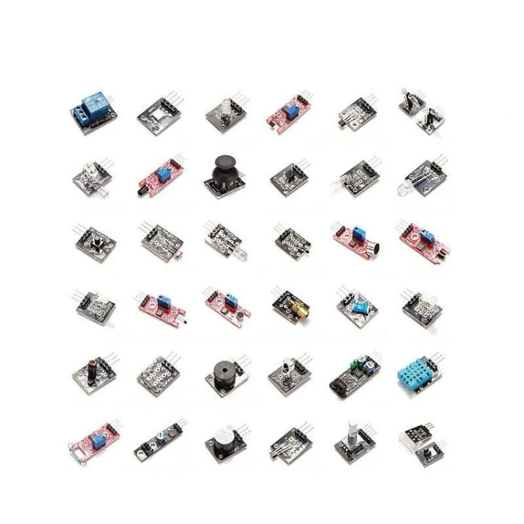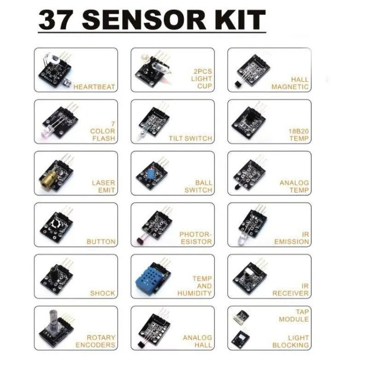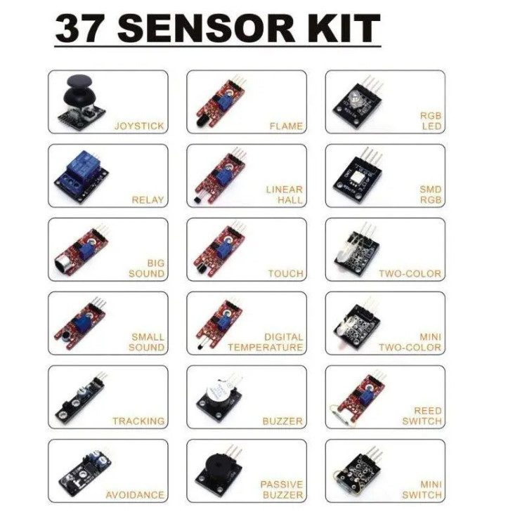 این پک شامل قطعات و ماژولهای کاربردی برای کار با آردوینو می باشد و فاقد سخت افزار آردوینو می باشد: Package Include: 1 x Small passive buzzer module 1 x 2-color LED module 1 x Hit sensor module 1 x Vibration switch module 1 x Photo resistor module 1 x Key switch module 1 x Tilt switch module 1 x 3-color full-color LED SMD modules 1 x Infrared emission sensor module 1 x 3-color LED module 1 x Mercury open optical module 1 x Yin Yi 2-color LED module 3MM 1 x Active buzzer module 1 x Temperature sensor module 1 x Automatic flashing colorful LED module 1 x Mini magnetic reed modules 1 x Hall magnetic sensor module 1 x Infrared sensor receiver module 1 x Class Bihor magnetic sensor 1 x Magic light cup module 1 x Rotary encoder module 1 x Optical broken module 1 x Detect the heartbeat module 1 x Reed module 1 x Obstacle avoidance sensor module 1 x Hunt sensor module 1 x Microphone sound sensor module 1 x Laser sensor module 1 x 5V relay module 1 x Temperature sensor module 1 x Temperature sensor module 1 x Linear magnetic Hall sensors 1 x Flame sensor module 1 x Sensitive microphone sensor module 1 x Temperature and humidity sensor module 1 x XY-axis joystick module 1 x Metal touch sensor module 1 x Box