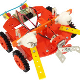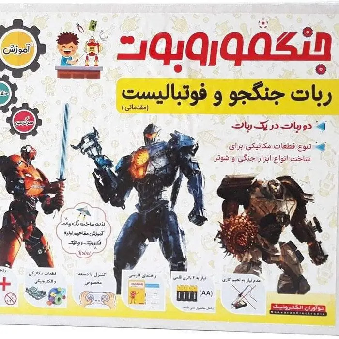 ربات جنگجو مقدماتی: در این ربات علاوه بر کنترل کامل بر حرکت چرخ های ربات (عقب، جلو، چپ و راست) از طریق دسته مخصوص ، ابزار جنگی الکتریکی نیز تحت فرمان کاربر می باشند که توسط کلیدهای مخصوص روی دسته قابل کنترل می باشد. همچنین ربات دارای دو چشم مجهز به لامپ LED در بالای ربات و یک لامپ LED پر نور در زیر ربات میباشد که جلوه های نوری خاصی را به ربات می دهند. ربات فوتبالیست مقدماتی: در این ربات نیز علاوه بر کنترل کامل بر حرکت چرخ های ربات (عقب، جلو، چپ و راست) از طریق دسته مخصوص ، همچنین امکان کنترل یک موتور دیگر (غیر از چرخ های اصلی) توسط ربات وجود دارد که از آن برای شوت کننده توپ و یا برای پاس دهنده توپ استفاده می شود. مزیت ویژه این محصول آن است که با تنوع بالای قطعات مکانیکی داخل بسته کیت به شما امکان خلاقیت بسیاری را می دهد ! چرا بخیریم ؟ حتما شما هم در اخبار و رسانه ها راجع به برگزاری مسابقات رباتیک خبرهایی شنیده اید. یکی از جذاب ترین و پرهیجان ترین بخش این رقابت ها، مسابقات ربات های جنگجو و فوتبالیست می باشد که در سطوح متنوعی از سنین (کودکان چند ساله تا افراد حرفه ای) برگزار می شود. شما با خرید این محصول، دو ربات یعنی ربات های جنگجو و فوتبالیست را در یک محصول بدست می آورید. در داخل محصول تمامی قطعات مورد نیاز برای ساخت هر دو ربات موجود بوده و شما با استفاده از دفترچه راهنمای فارسی محصول، به آسانی ربات را تکمیل می نمایید. مزیت ویژه این محصول این است که نیاز به هیچگونه لحیم کاری و کار با هویه را نداشته و بردهای الکترونیکی ربات توسط ما مونتاژ و تست شده اند و همچنین تنوع بالای قطعات مکانیکی داخل محصول به شما امکان خلاقیت بسیار زیادی را می دهد ! قابلیتها: دارای دو عدد موتور DC استفاده از کانکتور های سیم دار آماده به منظور سهولت در کار شاسی و قطعات مکانیکی مورد نیاز برای ساخت دو نوع ربات به همراه بیش از 40 عدد قطعه مکانیکی متفاوت برد الکترونیکی مونتاژ شده و تست شده دسته کنترل ربات به همراه سیم بلند کنترل ربات در تمامی جهات(جلو، عقب، راست، چپ) کلیدهای مجزا برای شوتر و ابزار جنگی بر روی دسته کنترل لامپ LED پر قدرت و جذاب به منظور روشن نمودن اطراف ربات موتور مجزا جهت استفاده برای شوتر و یا ابزار جنگی دو قطعه مخصوص به عنوان چشم ربات به همراه لامپ های LED گیربکس با قابلیت اتصال به قطعات مکانیکی ربات به همراه راهنمای کامل مونتاژ ربات قاب با طراحی بسیار زیبا از جنس ABS (مقاوم در برابر شکستن)
